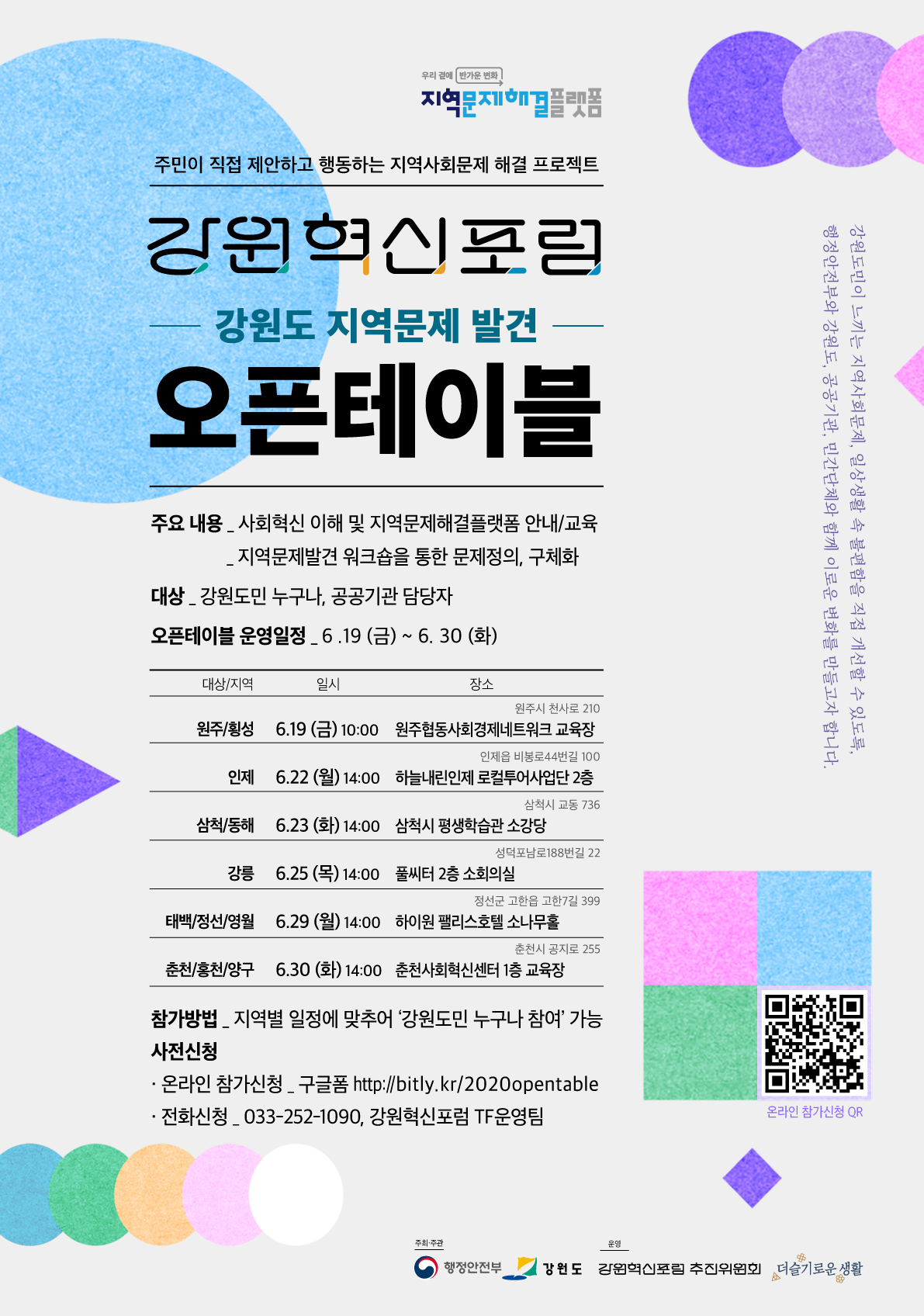 강원혁신포럼 오픈테이블 일정 안내드립니다!오픈테이블에서는 사회혁신에 대한 이해를 돕기 위한 안내와 ...