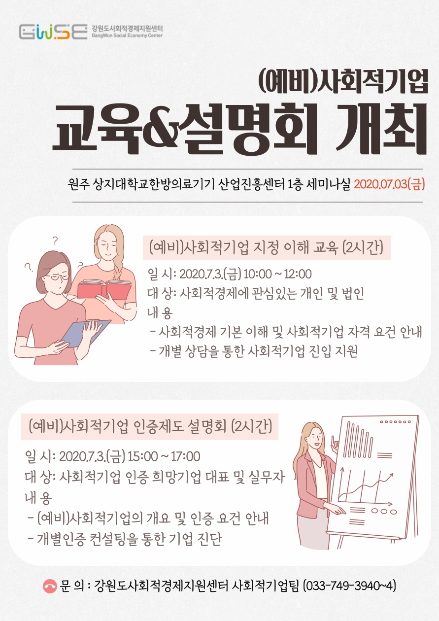 | [공고] 한국사회적기업진흥원 | '20년 제4차 경영컨설팅 "사전진단 및 매칭" 신청 안내(~6/25(목) 정오) (0) | 2020.06.23 |