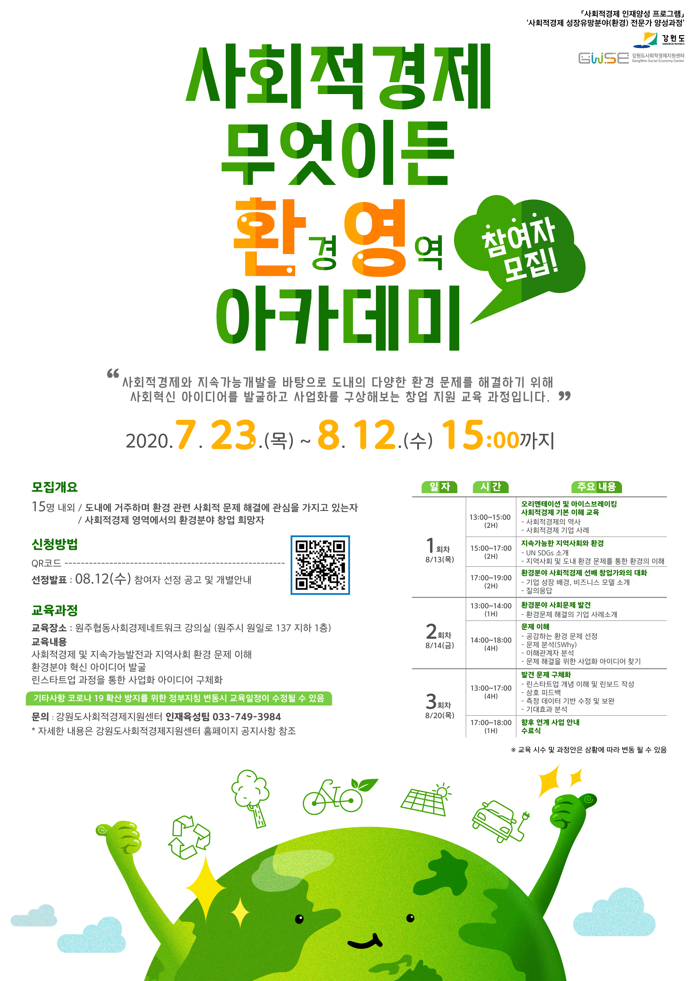 강원도사회적경제지원센터는 환경 문제 해결에 관심을 가지고 이를 해결하기 위한 유망 아이디어·창업자를 발굴하기 위한「사회적경제 무엇이든 환영(환경영역) 아카데미」교육을 운영하오��