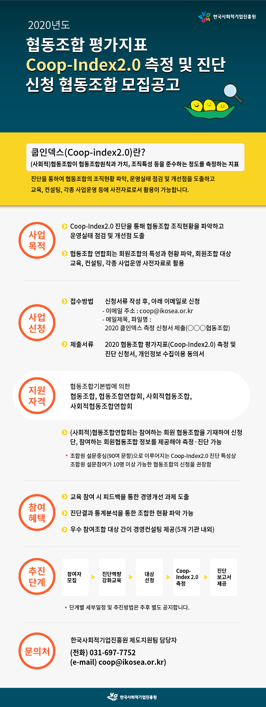 * 조합원 설문중심(총 92 문항)으로 이루어지는 쿱인덱스2.0 진단 특성상 조합원 설문참여가 10명 이상 가능한 협동조합의 신청을 권장함.