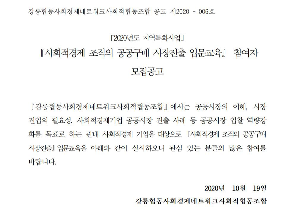 강릉협동사회경제네트워크에서는 공공구매 시장의 이해, 진입 필요성, 진출사례 등 공공시장 입찰 역량강화를 목적으로 하는 관내 사회적경제 기업을 대상으로 『사회적경제조직의 공공구매 시장진출 입문교육』을 실시합니다.