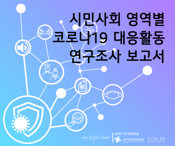 시민사회단체연대회의, 공익활동가협동조합동행은 서울시NPO지원센터의 2020NPO참여예산제 사업을 통해 "코로나19 타파연대"를 결성하여 2020년 상반기 코로나19 위기 1차 대유행 시 시민사회 영역별로 코로나19 대응활동이 어떻게 진행되었는지 연구조사하였습니다.