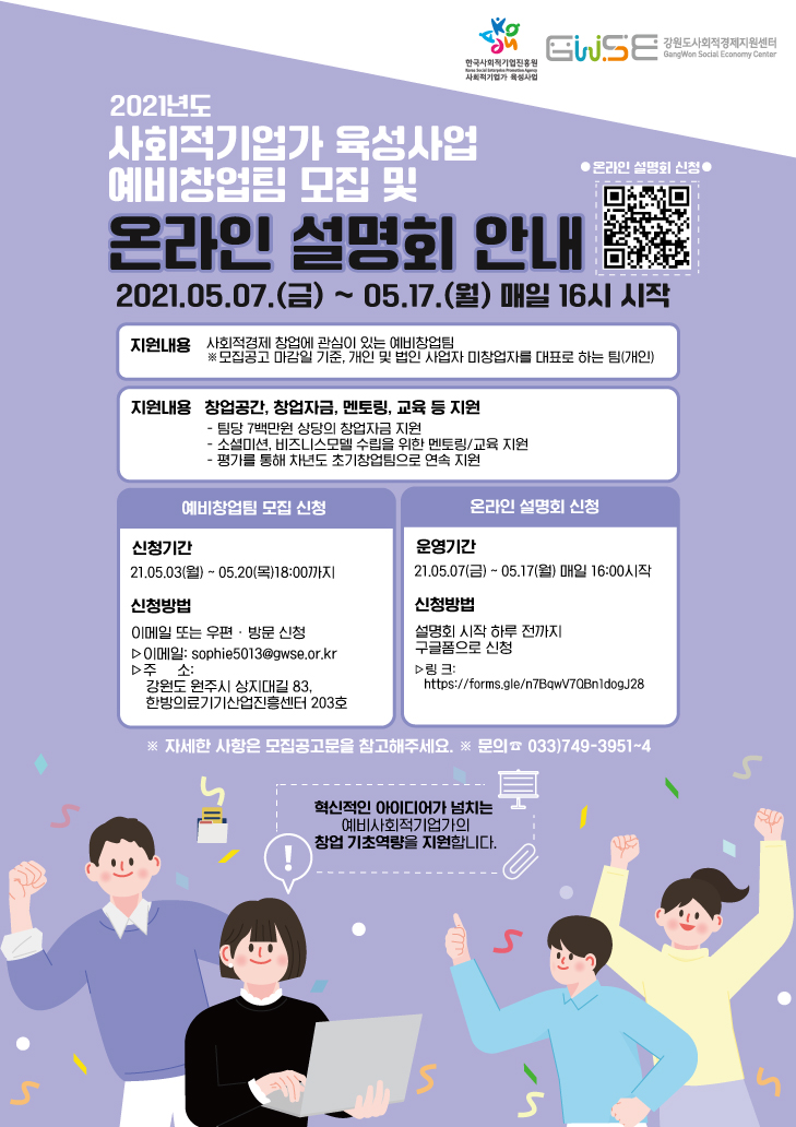 ○ 2021년 사회적기업가 육성사업 예비 창업팀 모집공고: https://gwse.or.kr/bbs/board.php?bo_table=sub41&wr_id=1970
