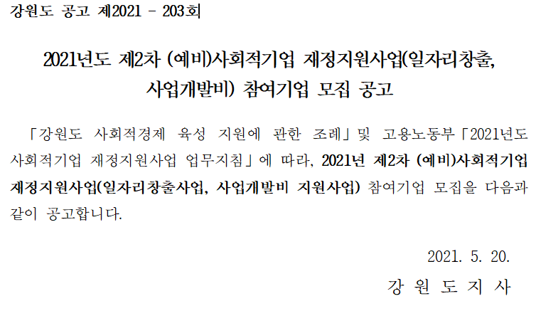 [강원도] 2021년도 제2차 (예비)사회적기업 재정지원사업(일자리창출, 사업개발비) 참여기업 모집