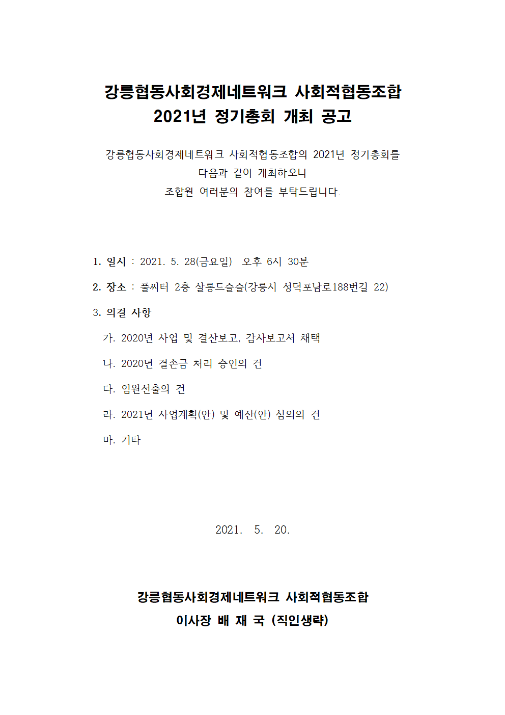 [ 강릉협동사회경제네트워크 사회적협동조합 2021년 정기총회 개최 공고 ]