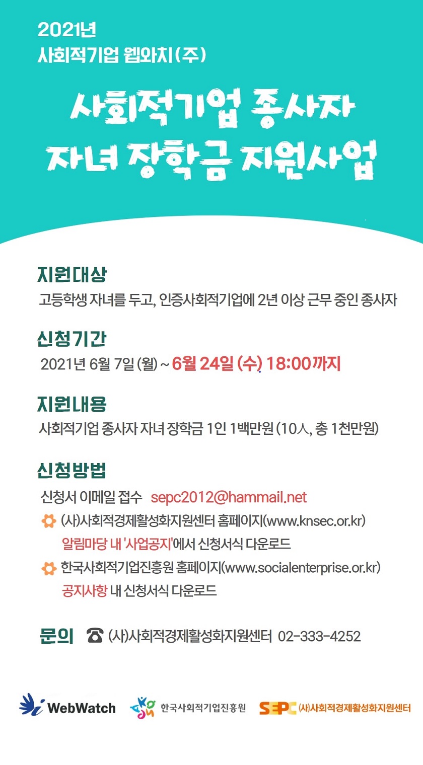 [공고문] 2021년 웹와치(주) 사회적기업 종사자 자녀 장학금 지원사업.hwp