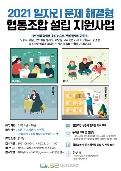 「2021 일자리 문제 해결형 협동조합 설립 지원사업」에 참여할 희망자를 모집하오니 많은 참여 바랍니다.