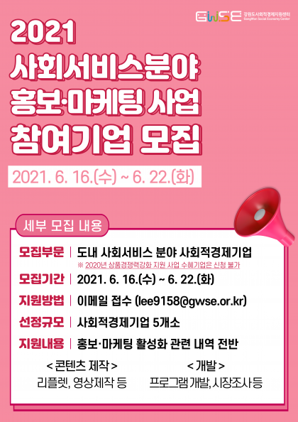 「2021년 사회서비스분야 홍보마케팅 지원 사업」 참여기업 모집 공고 > 강원사경센터 공지 | 강
