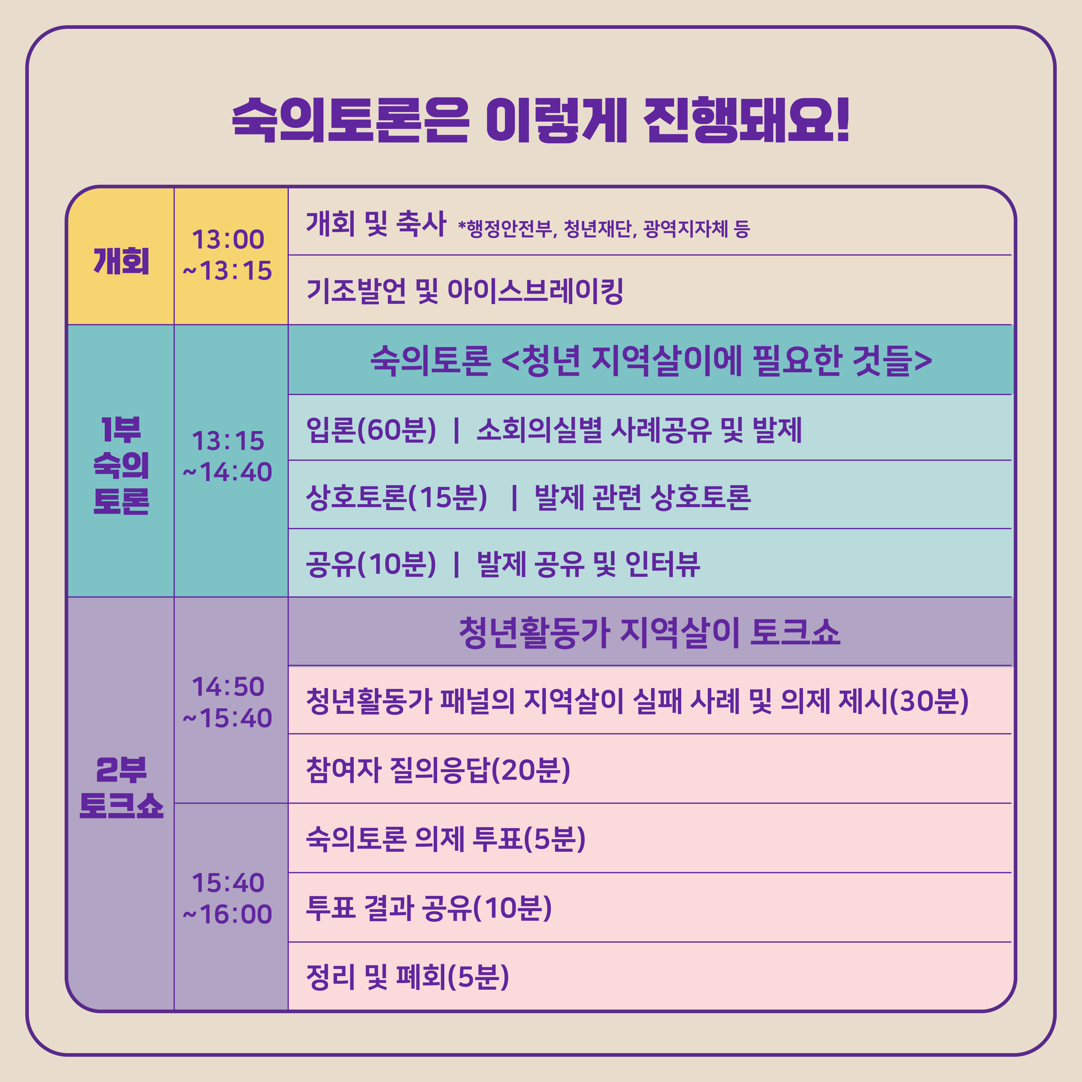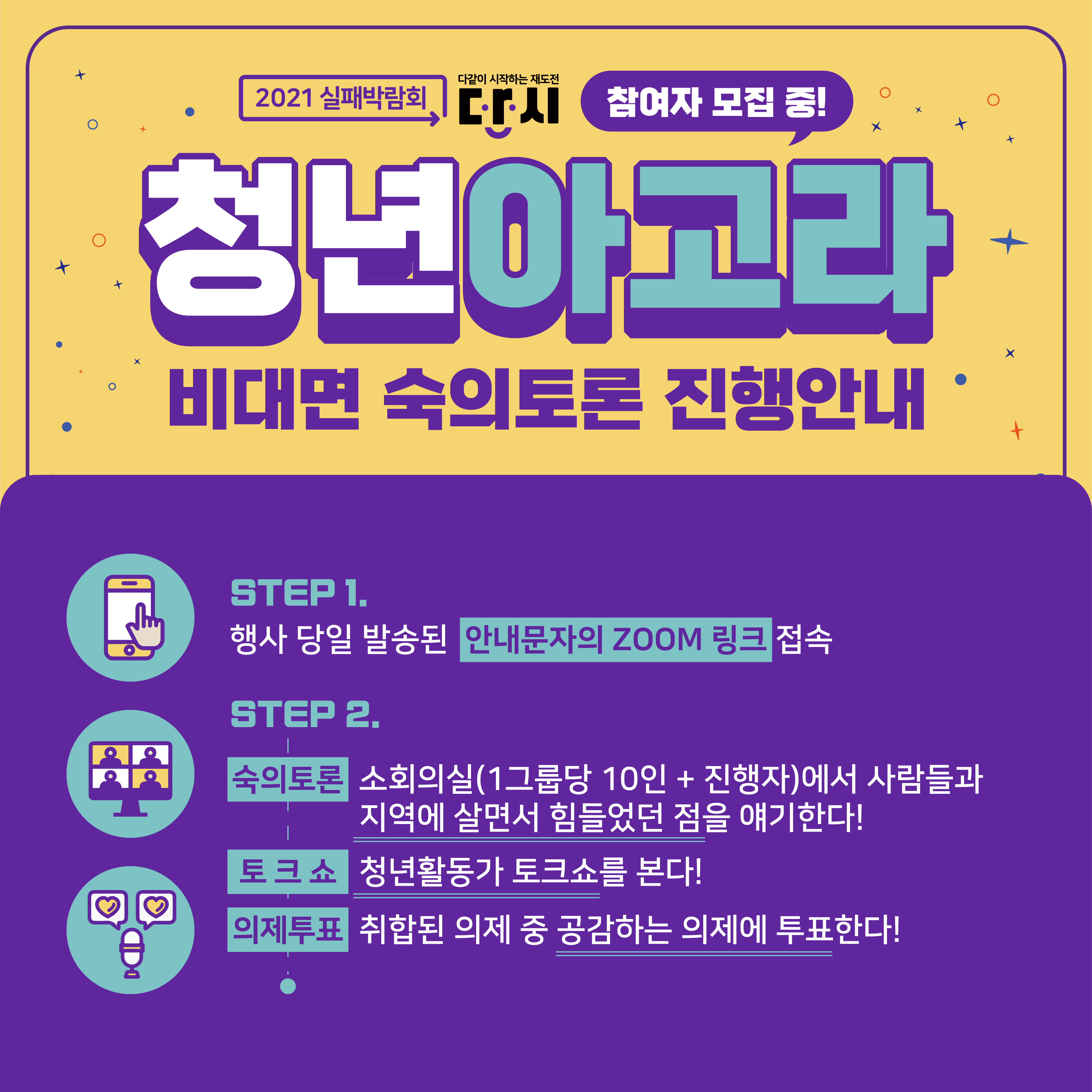 "대학생, 청년 근로자, 창업가, 예술가, 농부, 주부, 장애인 등 우리 지역의 청년 당사자로서, 내가 살고 있는 곳이 더 좋아지게 하는 방법은? 살고 있는 내가 직접 말하기! 지역이 발전했으면 하