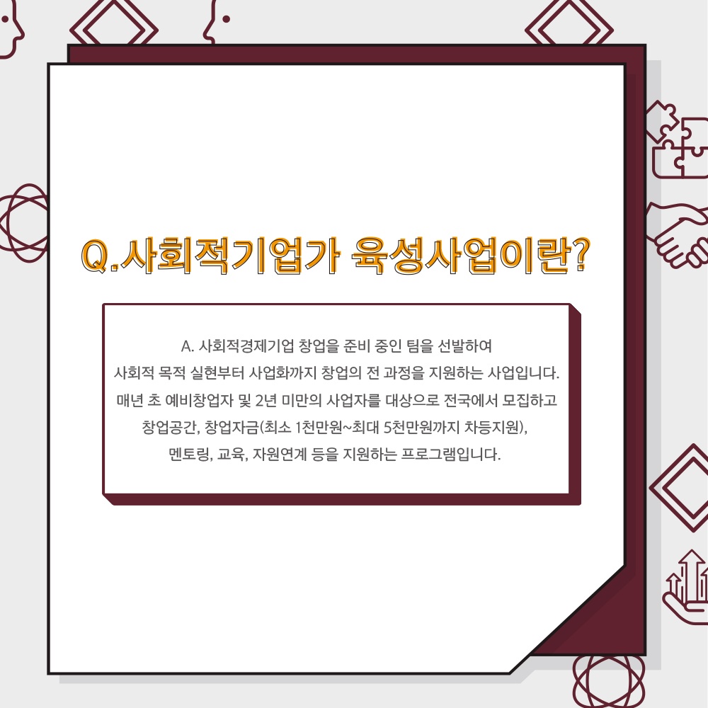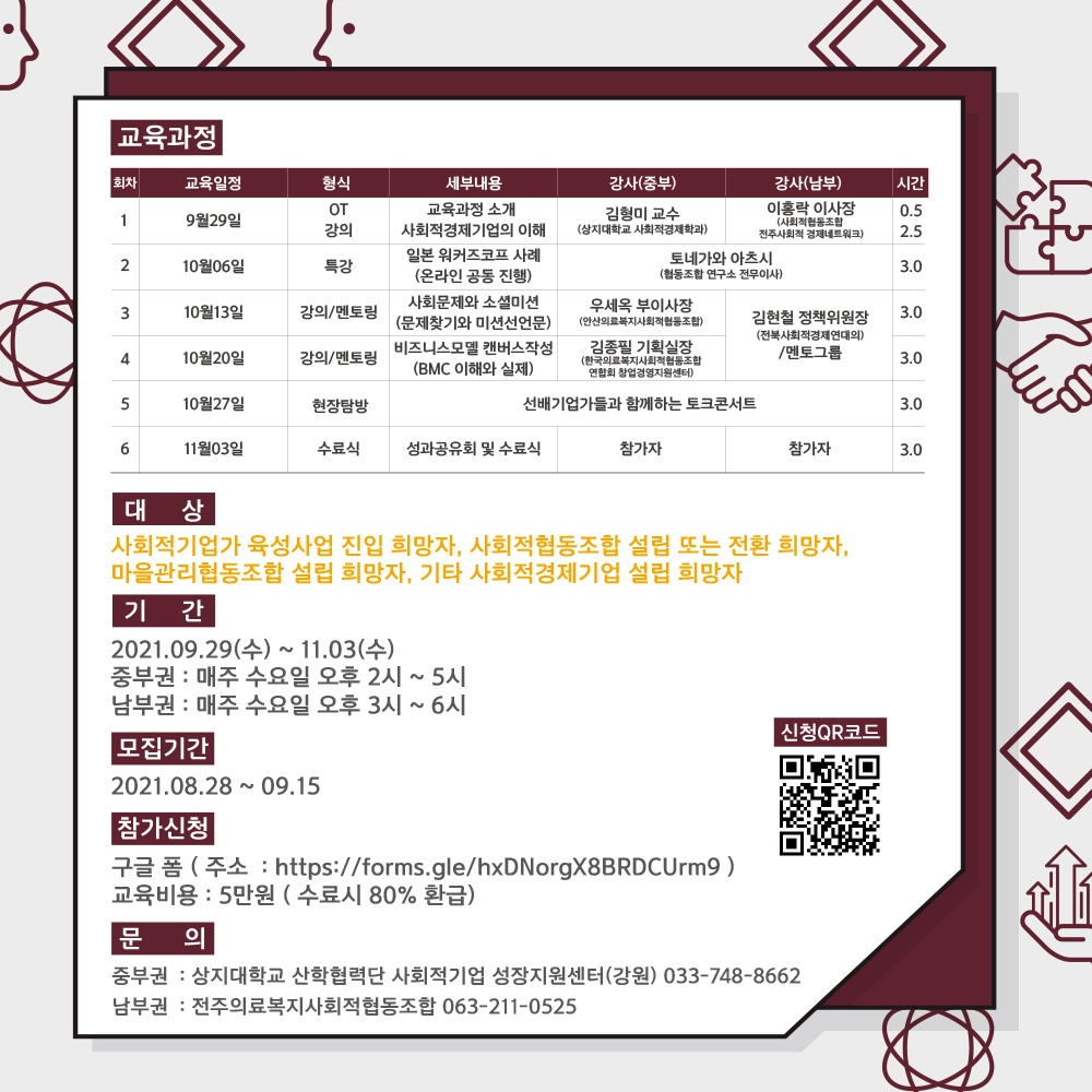- 교육대상 : 사회적기업가 육성사업 진입 희망자, 사회적협동조합 설립 또는 전환 희망자, 마을관리협동조합 설립 희망자, 기타 사회적경제기업 설립 희망자