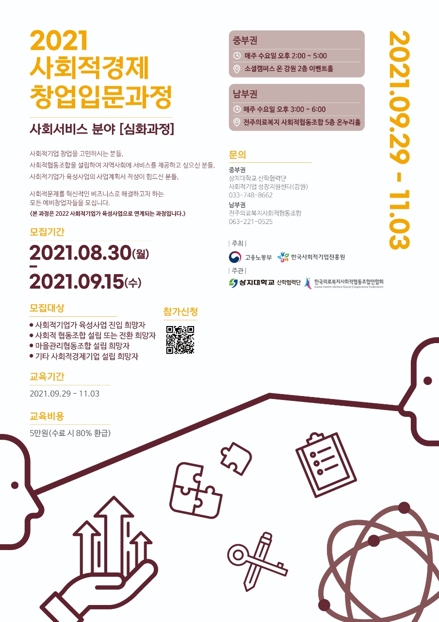 - 문 의 : 중부권 - 상지대학교 산학협력단 사회적기업 성장지원센터(강원) 033-748-8662, 남부권 - 전주의료복지사회적협동조합 063-211-0525