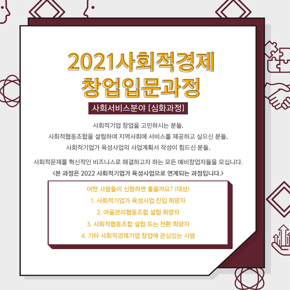 <2021년도 사회적경제 사회서비스 분야 창업입문과정(심화) 과정 교육생을 모집합니다>