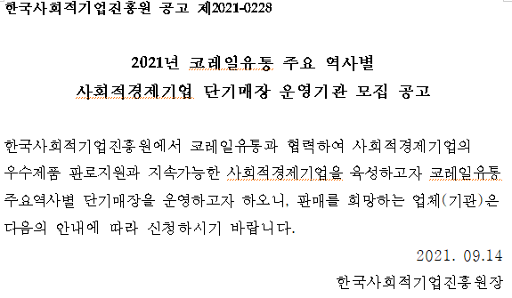 코레일유통 주요역사내 사회적경제기업 단기매장 운영기관 모집공고문(최종).hwp