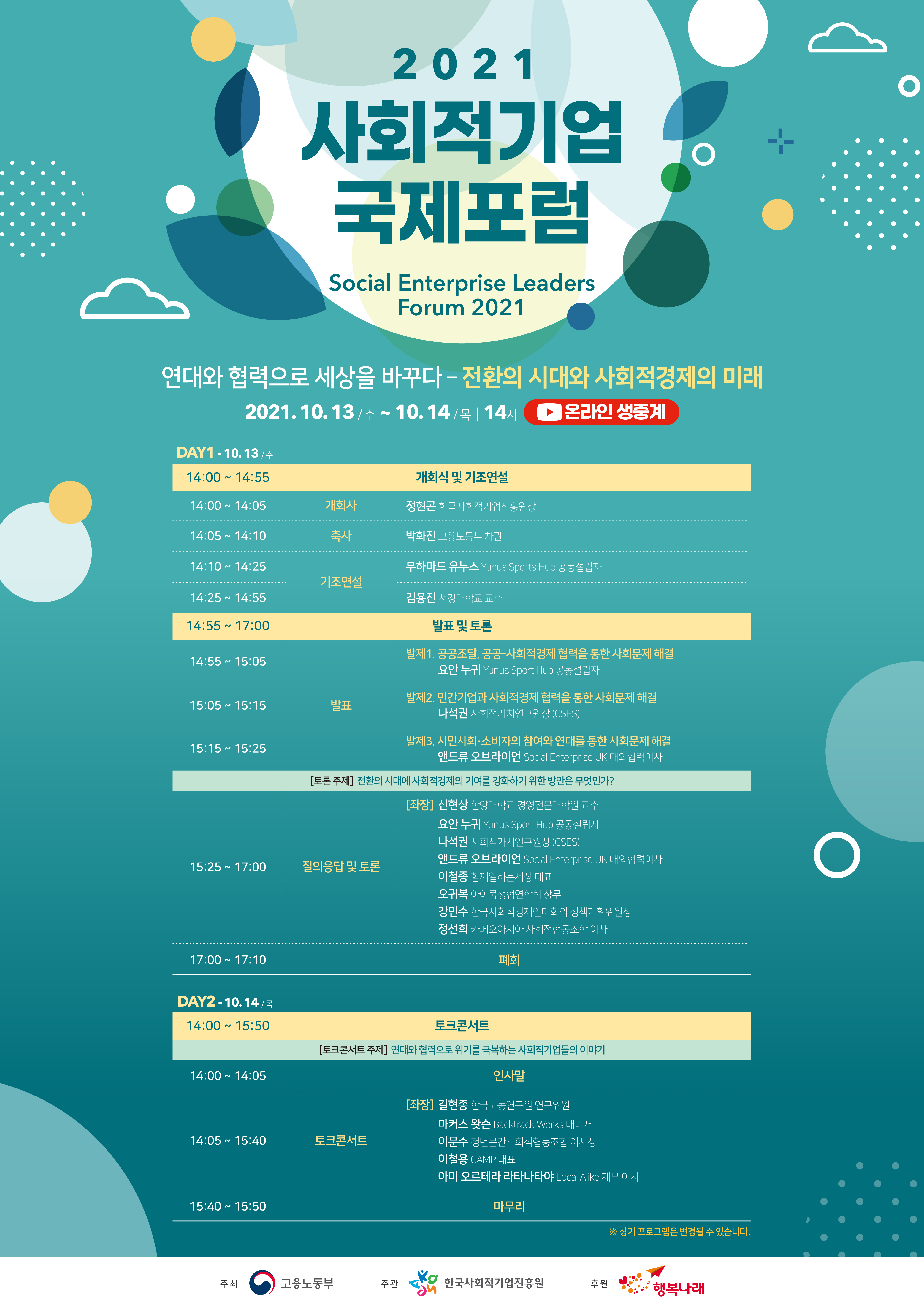 2021 사회적기업 국제포럼이 10.13.(수), 10.14.(목) 양일간 온라인 생중계로 진행되오니 많은 관심과 참여 바랍니다.