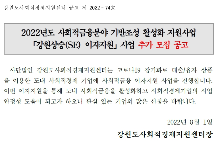 | [안내] 강원도사회적경제지원센터 | 2022년 「강원상승(SE) 이자지원」모집공고 (0) | 2022.07.21 |