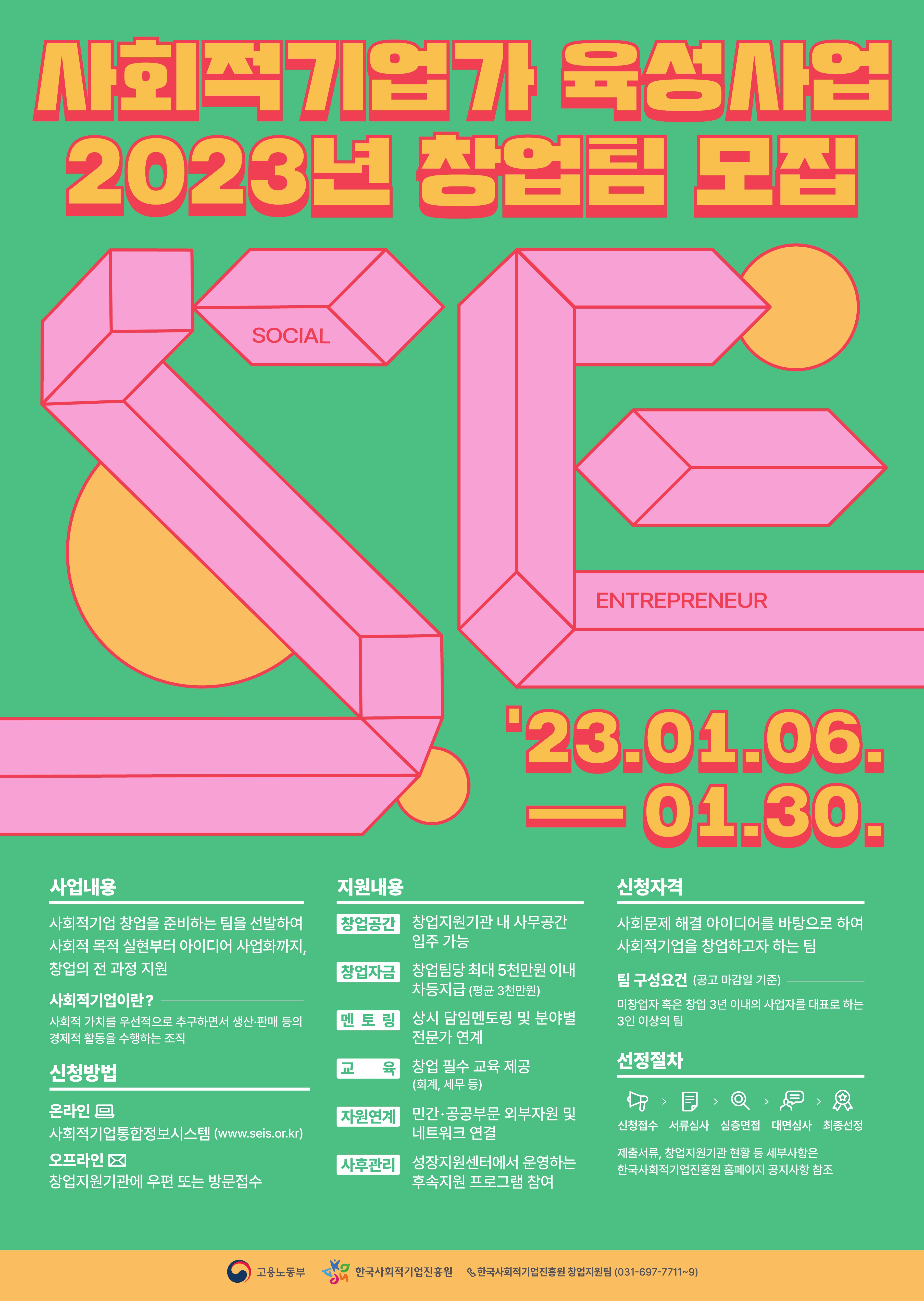 | [공고] 고용노동부 | 2023년 사회적경제기업 성장집중 지원사업 고용노동부 추천기업(사회적기업) 모집 공고(~2/13) (0) | 2023.02.01 |