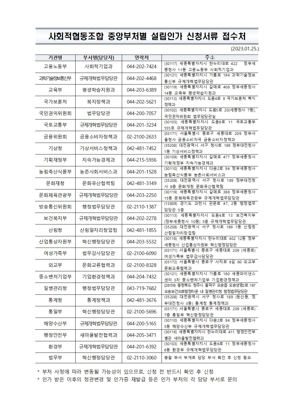 사회적협동조합 부처별 설립인가 신청서류 접수처 안내(23년 1월 기준)