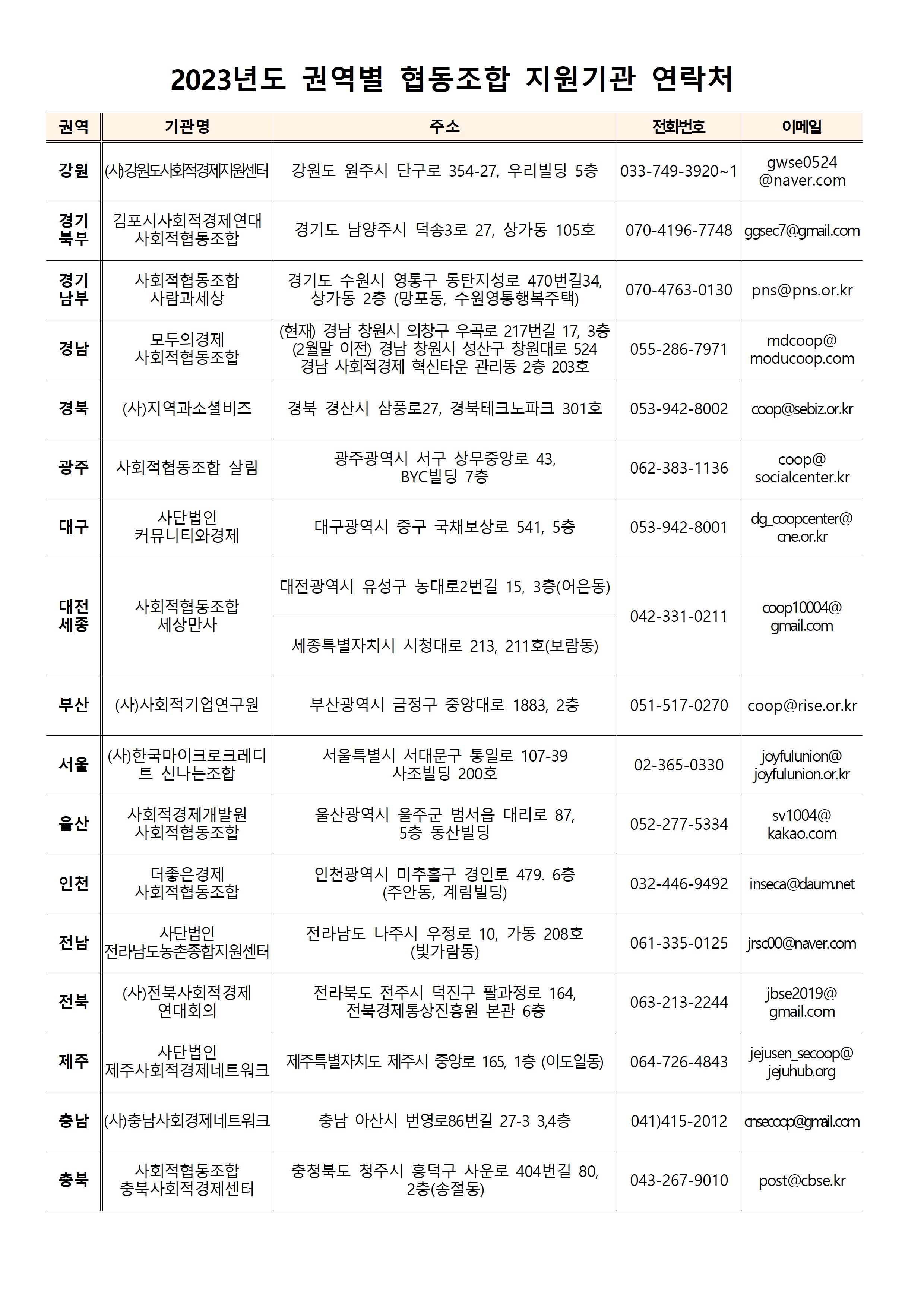 내용 [안내] 2023년 권역별 협동조합 지원기관 안내 ♡협동조합 및 사회적협동조합 관련 무료 설립상담/교육/경영공시 컨설팅 제공♡ 한국사회적기업진흥원은 여러분의 성공적인 협동조합 설립