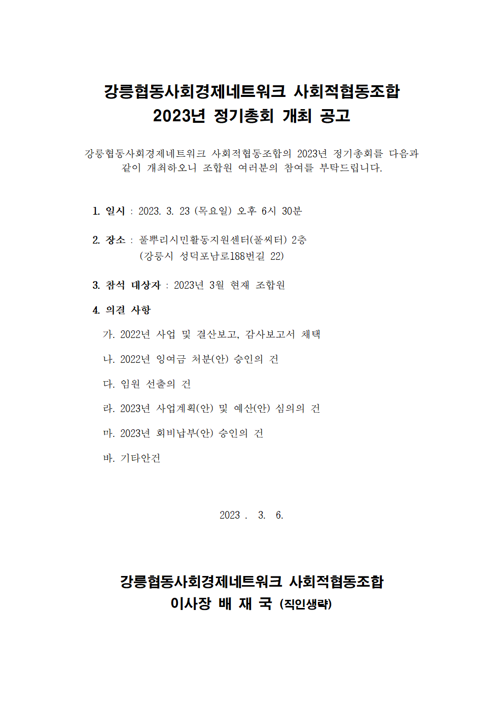| 강릉협동사회경제네트워크 사회적협동조합 임원 선출 공고 (0) | 2023.03.06 |