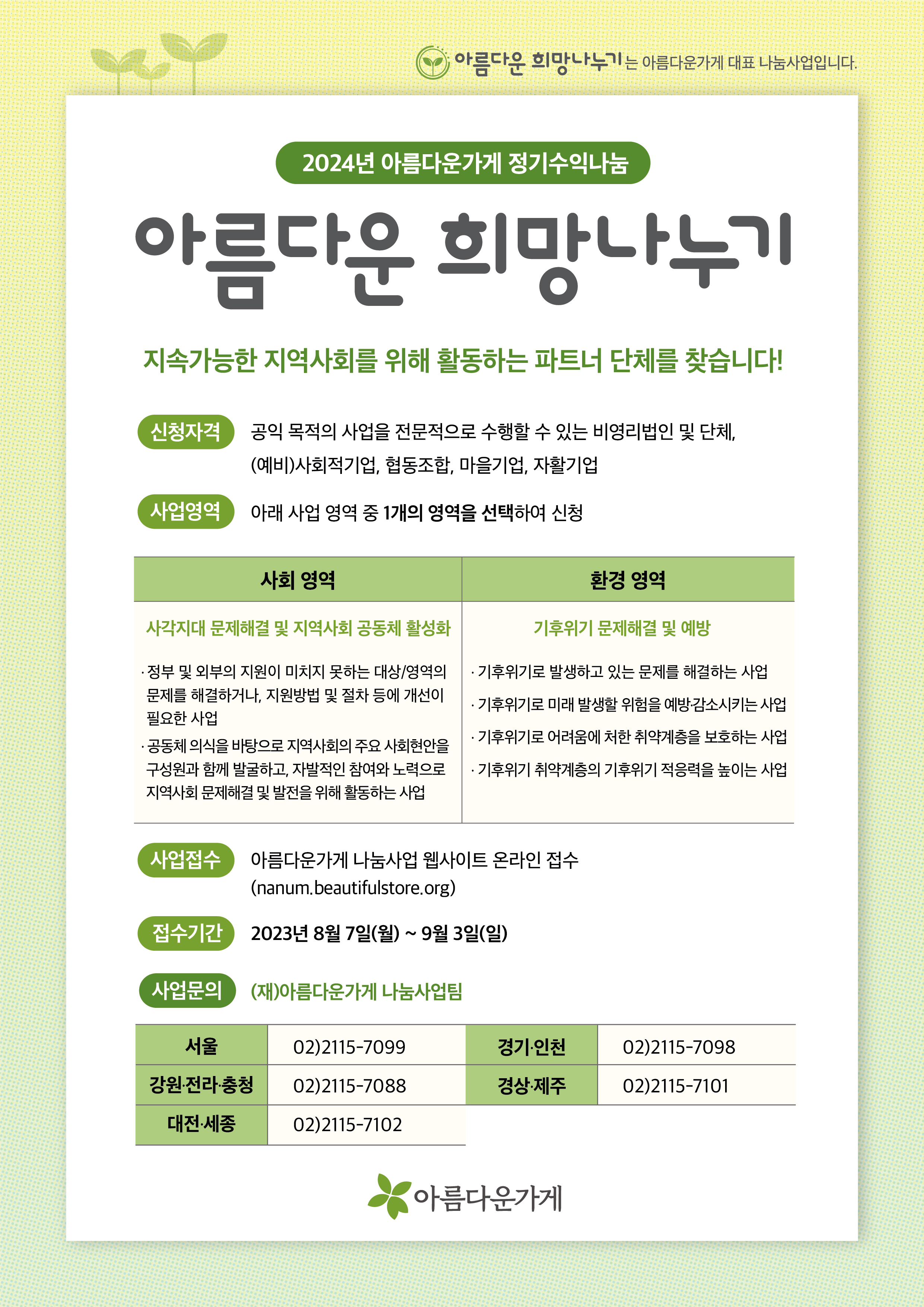 (재) 아름다운가게, 2024 아름다운 희망나누기가 시작됩니다. 아름다운가게는 지역사회 중심의 사회통합 및 기후위기 대응을 위하여 '사회', '환경' 영역에서의 지역활동을 지원하고자 합니다