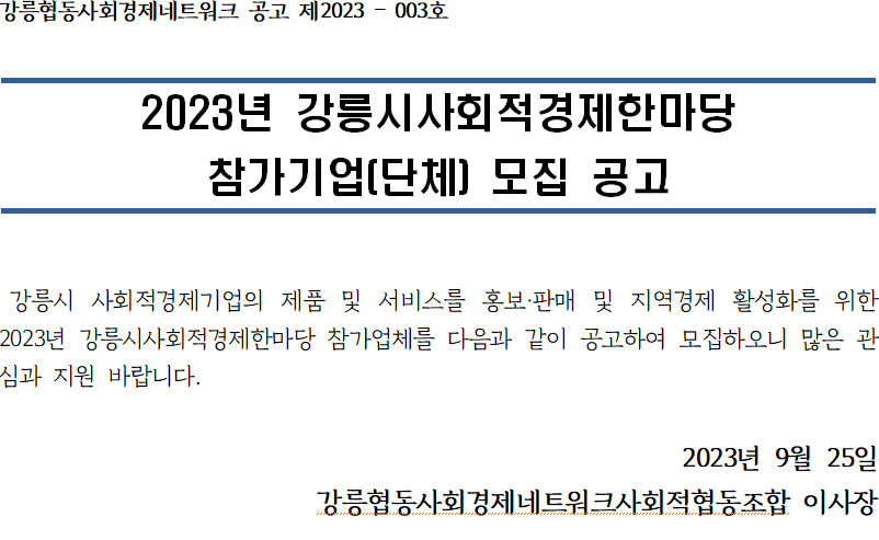 강릉시 사회적경제기업의 제품과 서비스를 홍보, 판매하고 지역경제 활성화를 위한 2023년 강릉시사회적경제한마당 참가업체를 다음과 같이 공고하여 모집하오니 많은 관심과 지원 바랍니다. 20
