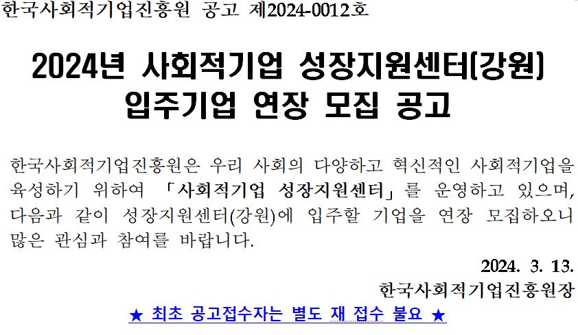 2024년 사회적기업 성장지원센터(강원) 입주기업 모집 연장공고(~3.21. 14:00)
