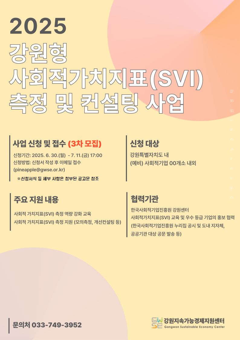 (사)강원지속가능경제지원센터는 강원특별자치도 내 (예비)사회적기업이 창출하는 사회·경제적 가치 수준을 객관적으로 측정하고, 1:1 맞춤형 컨설팅을 제공하여 사회적가치 창출 역량을 강화하기 위한 「2025년 강원형 사회적가치지표(SVI) 측정 및 컨설팅」 사업을 실시하오니 많은 신청을 바랍니다.