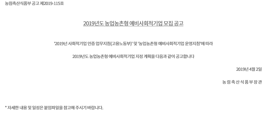 | 2019년 통일형 예비사회적기업 지정계획 공고 (0) | 2019.04.11 |