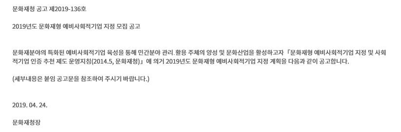 | 2019년 통일형 예비사회적기업 지정계획 공고 (0) | 2019.04.11 |