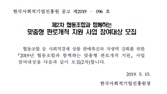 | [공지] 강원도사회적경제지원센터 | 2019년도 제2차 (예비)사회적기업 재정지원사업 설명회 개최 (5월 20일) (0) | 2019.05.15 |