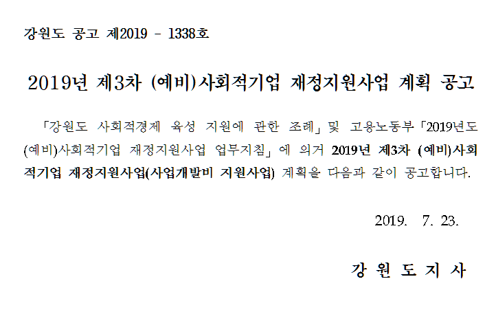 「강원도 사회적경제 육성 지원에 관한 조례」및 고용노동부「2019년도 (예비)사회적기업 재정지원사업 업무지침」에 의거 2019년 제3차 (예비)사회적기업 재정지원사업(사업개발비 지원사업) 계획을 다음과 같이 공고합니다.