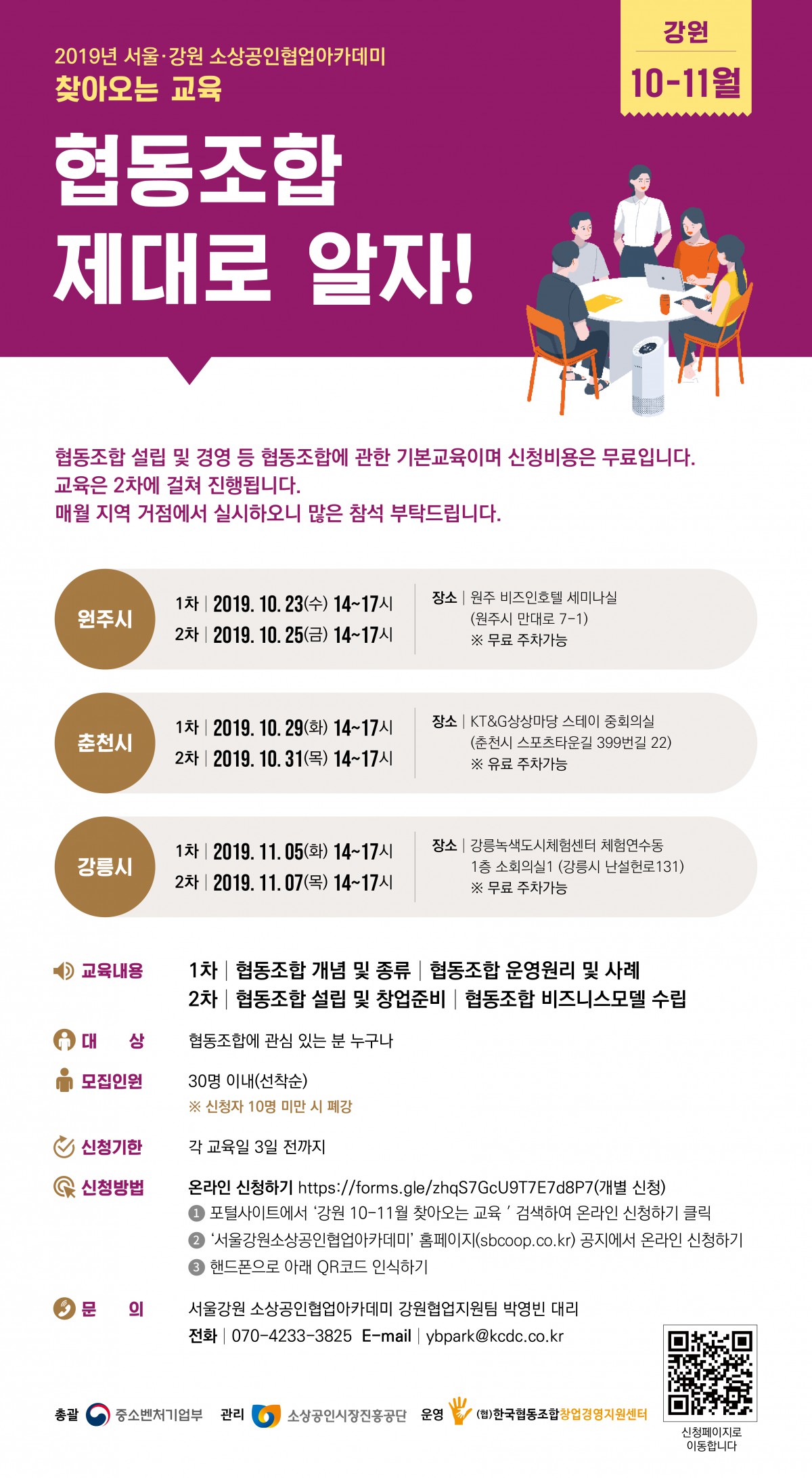 2019년 서울강원지역 소상공인협업아카데미에서 협동조합 실전창업교육을 아래와 같이 진행합니다. 협동조합 창업 및 설립에 관심 있는 분들의 많은 참여 부탁드립니다. ■ 교육프로그램 소개 - 설립 및 경영 등 협동조합에 관한 기본교육이며 이용자가 직접 찾아오는 집합 교육입니다. ■ 대상 : 협동조합에 관심 있는 누구나 ■ 신청기한 : 각 교육일 3일 전까지 ■ 교육인원 : 30명 이내(선착순) ※ 신청자 10명 미만 시 폐강 ■ 교육비 : 무료(교육비 및 교