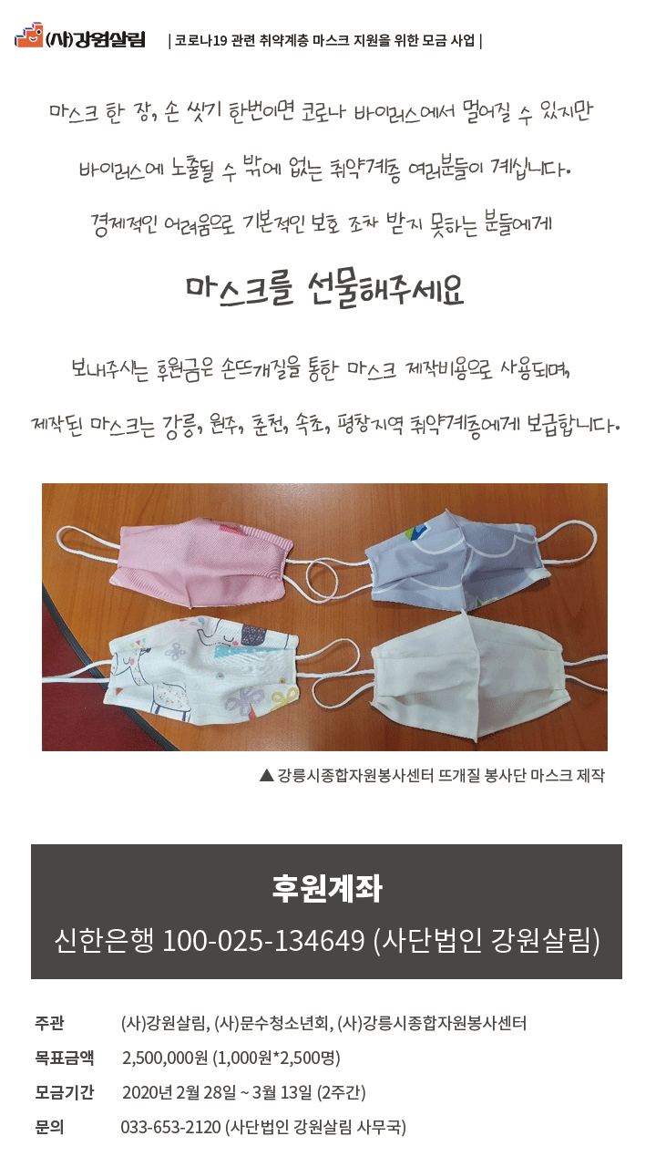 강릉협동사회경제네트워크 사회적협동조합은 (사)강원살림의 마스크 보급사업에 후원하고자 기금을 마련하려고 합니다.