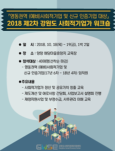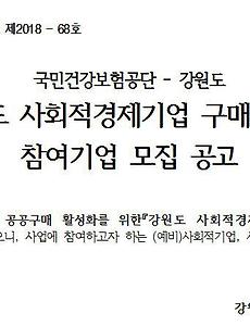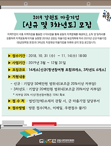 열린알림방669 [공고] 강원도 | 2019 강원도 마을기업 [신규 및 3차년도] 모집 2019년 강원도 마을기업 신규 및 3차년도 모집 공모 * 공고 및 접수기간 : 2018. 10. 31. (수) ~ 11. 14.(수) 18:00 자세한 사항은 첨부파일을 참고해주세요. 2018. 11. 5. [안내] 강릉시지역사회보장협의체 | 2018 우리동네 복지한마당 2018. 10. 28. [안내] 중소기업벤처기업부 | 협동조합 전용자금 안내 2018. 10. 25. [공고] 강원도사회적경제지원센터 | 『국민건강보험공단 – 강원도』 강원도 사회적경제기업 구매상담회 모집공고 2018. 10. 23. [안내] 강원혁신포럼 | 의제수렴 권역별 심층테이블 안내 (강릉 : 25일 19시) 강원혁신포럼 아이디어를 모집합니다.지역에서 느끼는 주차문제, 쓰레기문제 등 불편하고 변했으면 하는 많은 사회문제들,변화에 대해 실천하지 못했던 지역 사화문제들을 개선시킬 아이디어를 모집합니다.여러분이 지역 사회에서 느끼셨던 사회문제를 강원혁신포럼에 제안해주세요.강원혁신포럼은 강원도민들이 느끼는 지역 사회문제를 해결 할 수 있도록강원도와 행정안전부, 공공기관이 함께 참여하여 협업 프로젝트로 발전시키는 것을 목표로 하고 있습니다.포럼에서 발표된 의제들과 제안자, 그리고 공공기관들이 매칭이되어 공공기관들의 지원을 통한 사회혁신 프로젝트가 향후 진행이 될 예정입니다. 사회문제에 대해 개선할 수 있는 아이디어를 제안해주세요. 강원혁신포럼에서는 여러분의 아이디어를 기다리고 있습니다. 강원혁신포럼과 관련된 설명회를 .. 2018. 10. 18. [안내] 협동조합 전용자금 접수 게시 안내 -------------------------------------------------------------------------------- 협동조합 전용자금 접수 게시 안내 -------------------------------------------------------------------------------- 사업개요 협동조합기본법 또는 중소기업협동조합법에 의거하여 설립된 협동조합이 필요로 하는 장비 및 시설도입, 경영안정 등에 필요한 자금을 지원해 드리는 사업입니다.☞ 협동조합기본법 또는 중소기업협동조합법에 의거하여 설립된 협동조합☞ 기업 당 5억원 이내(운전자금 연간 1억원 이내) 지원 지원분야 및 대상 ㅇ 신청대상 - 사업자등록증을 소지한 법인 사업자로 아래 협동조합 신청대상 기준에 해.. 2018. 10. 17. [안내] 2019 K-웰니스 설날 착한선물전 (사)한국웰니스산업협회 에서는 농림부·중소벤처부 후원으로 내년 1월에 설 대목을 앞두고 킨텍스에서 선물전을 개최합니다. 우수한 품질과 유통혁신의 창업벤처, 농촌특산 착한선물이 한 자리에 모이는 2019 K-웰니스 설날 착한 선물전에 관심있는 많은 기업의 참가 바랍니다. 2018. 10. 17. [공고]한국사회적기업진흥원 | 2018년 청년 협동조합 창업 아카데미 참가자 모집 가. 교육명 : 2018년 청년 협동조합 창업 아카데미 나. 참가대상 - 2016~2018년 청년 협동조합 창업지원 선발팀(창업팀) - 2018년 COOP-BIZ 아이디어 공모전 참가자 - 협동조합 설립에 관심이 있는 일반 대중 다. 일시 장소 구분 주제 일시 장소 강사 Section 1. 문제정의 워크시트 실습을 통한 협동조합 사업 모델 구체화 2018. 10. 20. (토) 10:00~18:00 (7시간) 서울 삼경교육센터라움 5층 1강의실 이그나잇스파크 대표 Section 2. 설립 초기 단계의 협동조합 운영 개선 교육 2018.10.27.(토), 10:00~17:00 (6시간) 서울 애드로쿰 아이쿱협동조합 지원센터 부문장 및 선배 협동조합(예정) 라. 문의 - 협동조합본부 설립지원팀 홍정우 주임 .. 2018. 10. 15. 강원도사회적경제지원센터 | 『강원혁신포럼 오픈테이블』 참가자 모집 ★ 지역사회문제 해결, 『강원혁신포럼 오픈테이블』 참가자 모집합니다. ★ “ 강원혁신포럼은 주민이 주도하고 대한민국 대표 공공기관과 정부가 협동하여 사회문제 해결에 함께하는 사회문제 해결형 플랫폼 입니다. ” 11월 14일에 개최되는 강원혁신포럼의 사전 작업으로 강원도 내 6개 지역을 대상으로 각 1회 오픈테이블을 개최하려 합니다. 지금 살고있는 동네, 더 나아가 지역에 해결하고 싶은 문제점들이 많다면, ☞ 바로 여기! 강원혁신포럼 오픈테이블에서 자유롭게 말하고 해결책을 찾아더 살기 좋은 지역을 내가, 우리가 만들 수 있습니다.지역의 문제를 함께 해결 해 나갈 시민분들은 밑의 경로로 신청 해주세요 ▣ 강릉시는 아래와 같이 오픈테이블이 진행될 예정이니 참고 부탁드립니다.- 일시: 10.16 (화) 19:0.. 2018. 10. 12. 강원도사회적경제지원센터| 2018 제2차 강원도 사회적기업가 워크숍 안내 2018. 10. 11. [공지] 2018년도 협동조합 워크숍 개최 안내 2018년도 협동조합 워크숍 개최 안내 1) 행 사 명 : 2018 협동조합 워크숍 2) 일 시 : 2018년 10월 26일(금) 오후 2시 ~ 5시 3) 장 소 : 풀씨터 2층, 살롱 드 슬슬 4) 참여기관 : 협동조합 운영관계자 및 협동조합 설립희망자 5) 행사내용 - 협동조합 교육 _ 이은주(즐거운세상협동조합 前 이사장) - 협동조합 간담회 참가신청 : https://goo.gl/forms/VDJvnYAqy7tRwNTf2 2018. 10. 10. [공지] 강원도사회적경제지원센터 | 2018 찾아가는 사회적경제 설명회(삼척시) 일정 안내 2018 찾아가는 사회적경제 설명회(삼척시) 일정 안내 □ 개 요 ○ 일 시 : 2018. 10. 11.(목), 14:00 ~ 16:00 ○ 장 소 : 삼척시청 본관 시민회의장 ○ 대 상 : 사회적경제에 관