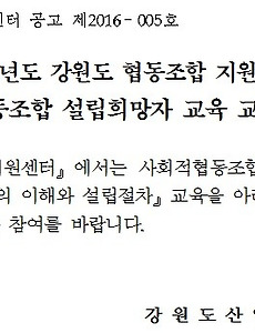 열린알림방669 [공고] 2016 사회적경제 전문가 양성교육(학교협동조합 특화과정) 교육생 모집_강원도사회적경제지원센터 강원도 사회적경제지원센터 공고 제2016-16호 2016 사회적경제 전문가 양성교육(학교협동조합 특화과정) 교육생 모집 공고 『강원도 사회적경제지원센터』에서는 학교협동조합의 교육적 가치를 공유하고 설립절차와 사례 교육을 통해 학교협동조합의 설립 활성화를 도모하고자 교사, 학부모, 사회적경제조직 임직원 및 유관기관 실무자를 대상으로『학교협동조합 특화과정』교육생을 아래와 같이 모집합니다. 2016년 5월 17일 강 원 도 산 업 경 제 진 흥 원 장 2016. 5. 20. [안내] SK(행복나래)사회적기업 판로지원 사업설명회 도내 사회적경제기업 판로확대를 위하여 SK에서 추진하는 「사회적기업 판로지원사업」설명회를 아래와 같이 알려드립니다. □ 사업설명회 개요 ○ 일 시 : 2016. 5. 25(수) 14:00~16:00 ○ 장 소 : 강원도청 별관4층 회의실 ○ 참석대상 : 40여명(사회적기업, 사회적협동조합, 창업기업, 지원기관 등) ○ 내 용 : ㈜행복나래 사업설명, 도 사회적경제지원센터 판로지원 설명 붙임 신청서 서식 1부. 끝. 2016. 5. 20. [공고] 2016년 강원도 사회적경제 학습 창업동아리 모집공고_강원도사회적경제지원센터 강원도사회적경제지원센터 공고 제2016-15호 2016 강원도 사회적경제 학습·창업동아리 모집공고 『강원도 사회적경제지원센터』에서는 도내 건강한 일자리 창출과 사회적경제 저변확대를 위하여 사회적경제를 학습하고, 사회적경제조직으로 창업을 희망하는 동아리·주민모임을 아래와 같이 모집합니다. 2016년 5월 12일 강 원 도 산 업 경 제 진 흥 원 장 2016. 5. 17. [공고] 청년 협동조합 창업 공모전 창업팀 모집 공고 한국사회적기업진흥원 공고 제2016 - 046호 2016년도 『청년 협동조합 창업 공모전』창업팀 모집 공고 다양한 협동조합 창업 아이디어를 발굴하고 우수한 사업 모델을 지원하기 위한 “2016년도 청년 협동조합 창업 공모전”을 아래와 같이 실시합니다. 공동의 꿈을 협동의 방식으로 실현해가는, 창업의 의지가 높은 청년분들의 많은 참여와 관심 부탁드립니다. 2016년 4월 18일 한국사회적기업진흥원장 2016. 4. 18. [안내] 2016년 강원도 (예비)사회적기업 기초컨설팅 지원사업 수진기업 모집공고 강원도 사회적경제지원센터 공고 제2016- 11호 「2016년 강원도 (예비)사회적기업 기초컨설팅 지원사업」수진기업 모집 공고 한국사회적기업진흥원과 강원도사회적경제지원센터는 도내 (예비)사회적기업의 경영문제를 해결하고 자립역량 강화에 기여코자 기초컨설팅(경영코칭) 지원사업을 실시하오니 수진을 희망하는 (예비)사회적기업의 많은 신청 바랍니다.2016 4 월 7 일 강원도 산업경제진흥원장 1. 모집개요 ○ 모집기간 : 2016년 4월 11일 ~ 9월 30일 ○ 사업기간 : 2016년 3월 2일 ~ 11월 30일 ○ 모집대상 : (예비)사회적기업 30개 ○ 지원분야 : 사전코칭, 인사·노무/회계·세무/법률·법무/멘토 방문코칭 ○ 신청자격 : 기초컨설팅 수진이력이 없는 강원도 내 (예비)사회적기업 ○ 선정방법 .. 2016. 4. 18. [안내] 청년 협동조합 창업 지원사업 지역 설명회 안내 「청년 협동조합 창업 지원사업」강원 지역 사업 설명회 계획(안) (일시) 2016.5.2.(월) 14시 (장소) 강원도 산업경제진흥원 B1 소강의실 (대상) 지역별 협동조합 설립 준비자, 창업 동아리 청년층 등 2016. 4. 18. [강원도사회적경제지원센터] 2016 협동조합 기초컨설팅 지원사업 공고 강원도 사회적경제지원센터 공고 제2016 - 8호 2016「협동조합 기초컨설팅 지원사업」공고 『강원도사회적경제지원센터』에서는 도內 설립 협동조합을 대상으로 운영역량 및 전문성 강화를 통한 자립경영 기반을 마련하기 위해 다음과 같이 기초컨설팅 지원사업을 실시하오니 관심 있는 협동조합들의 많은 참여를 바랍니다. 2016년 4월 4일 강 원 도 산 업 경 제 진 흥 원 장 2016. 4. 4. [공고] 협동조합 품평회 참여 조합 모집 공고 한국사회적기업진흥원 공고 제2016-29호 협동조합 품평회 참여 조합 모집 공고 협동조합 우수 제품 발굴 및 판로확대를 위해 개최되는 「협동조합 품평회」에 참여할 협동조합을 다음과 같이 모집합니다. 2016. 3. 24.한국사회적기업진흥원장 2016. 3. 30. [공고] 2016년 사회적경제 우수상품 선정 재공고 강원도 사회적경제지원센터 공고 제2016 - 007호 사회적경제 우수상품 선정 재공고 강원도 사회적경제지원센터는 2018평창동계올림픽 참여가능 사회적경제조직의 상품경쟁력 강화를 위한 사회적경제 우수상품 선정을 다음과 같이 추진하오니 관련 도내 사회적경제조직의 많은 관심과 참여 바랍니다. 2016년 3월 29일강원도 산업경제진흥원장 2016. 3. 30. 2016 제1차 사회적협동조합 설립희망자 교육 교육생 모집 공고 2016. 3. 24. [한국사회적기업진흥원] 사회적기업 스타상품 공모 한국사회적기업진흥원 공고 제 2016-17호 사회적기업의 상품경쟁력 강화 지원을 위한 『사회적기업 스타상품 공모 계획』 을 다음과 같이 공고합니다. 2016. 3. 10. [강원도사회적경제지원센터] 2016 찾아가는 협동조합 교육 2016. 3. 8. [동그라미재단] 로컬챌린지프로젝트 4기 권역별 사업설명