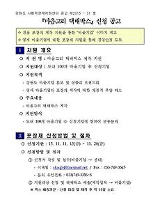 분류 전체보기1496 2018 평창 동계 올림픽 관광 상품 개발 디자이너 및 방과후 학교 퀼트 교육 강사 양성 사업 워크샵_11/30 2018 평창 동계 올림픽 관광 상품 개발 디자이너 및 방과후 학교 퀼트 교육 강사 양성 사업 워크샵 2015. 11. 30 강릉시청 1층 로비 2018동계올림픽 관광상품 개발 디자이너 및 방과후 학교 퀼트 교육 강사 양성 사업 워크샵 및 수료식을 진행하면서 2015년도 사업이 마감되었습니다. 1년동안 사업에 참여한 모든 분들께 감사합니다. 수고하셨습니다. 2015. 11. 30. 평창겨울올림픽 지역고용전략개발 포럼 안내 - 2015.12.02 ~ 03 평창겨울올림픽 지역고용전략개발 포럼』 2015년 하반기 종합포럼 개최계획(안) □ 주 제 : 평창겨울올림픽 사회적경제 참여와 일자리 창출 □ 목 적 ○ 평창겨울올림픽 사회적경제 참여를 통한 지역일자리 창출 방안을 모색하고 관련분야 전문가 및 주체들의 협력적 네트워크를 구축하고자 함 □ 일시 및 장소 ○ 일시 : 2015. 12. 2(수) 13:00 ~ 19:00 ※ 2015. 12. 3(목) 09:00 ~ 11:00 : 포럼 분과 통합 회의 ○ 장소 : 강릉 녹색도시체험센터 1층(강릉시 난설헌로 131) □ 참석대상 : 100명 내외 ○ 강원도 사회적경제(사회적기업, 마을기업, 협동조합, 자활기업 등) 기업대표 및 중간지원조직 관계자 등 ○ 올림픽 및 사회적경제 관련 행정 및 학계, 연구계 전문가 ○ 강.. 2015. 11. 27. 2018동계올림픽 관광상품 개발 디자이너 및 방과후 학교 퀼트 교육 강사 양성 사업 작품전시회_1123 2018동계올림픽 관광상품 개발 디자이너 및 방과후 학교 퀼트 교육 강사 양성 사업 작품전시회 2015. 11. 23 강릉시청 1층 로비 2018동계올림픽 관광상품 개발 디자이너 및 방과후 학교 퀼트 교육 강사 양성 사업 작품전시회가 11월 23일부터 25일까지 3일간 강릉시청 1층 로비에서 진행됩니다. 2015. 11. 23. 2018동계올림픽 관광상품 개발 디자이너 및 방과후 학교 퀼트 교육 강사 양성 사업 작품전시회 2018동계올림픽 관광상품 개발 디자이너 및 방과후 학교 퀼트 교육 강사 양성 사업 작품전시회 일시 : 2015. 11. 23 ~ 25 장소 : 강릉시청 1층 로비 주최 : 강릉시, 고용노동부 주관 : 강릉시사회적경제네트워크 2015. 11. 20. 강릉시사회적경제네트워크 11월 운영위원회 회의자료 및 회의록 첨부 강릉시사회적경제네트워크 11월 운영위원회 회의자료와 회의록을 인트라넷에 올려놨습니다. http://cafe.naver.com/gnsenet 2015. 11. 20. 강릉시사회적경제네트워크 4분기 정기 이사회 개최 안내_1126 강릉시사회적경제네트워크 4분기 정기 이사회 개최 안내 일시 : 2015. 11. 26. 18:30 (식사 후 19:00 부터 회의진행) 장소 : 오솔길 식당 2층 (강원 강릉시 토성로123번길 3) * 성원 보고 * 전차 회의록 보고 * 사업 보고 1) 강릉시사회적경제네트워크 사무국 - 회계 보고 - 경과 및 일정(예정) 보고 2) 사업 진행 보고 1) 15년 지역 맞춤형 일자리 창출 지원 사업 2) 15년 강원도 지역평생교육 활성화 공모사업 3) 15년 업종별 네트워크 구축운영 지원사업 4) 15년 지역특화사업 5) 15년 지역축제 참가 운영팀 지원사업 6) 15년 사회적경제네트워크 홍보 운영비 7) 15년 학술연구진흥지원사업 8) 16년 공모사업 진행보고 * 논의 안건 1) 신규회원(단체 및 개인) .. 2015. 11. 20. 2015년도 11월 정기 운영위원회_1119 2015년도 11월 정기 운영위원회 2015. 11. 19 07 : 00 p m 오솔길 식당 마카조은 사무실 강릉시사회적경제네트워크 11월 정기운영위원회가 진행되었습니다. * 성원 보고 * 전차 회의록 보고 * 사업 보고 1) 강릉시사회적경제네트워크 사무국 - 회계 보고 - 경과 및 일정(예정) 보고 2) 사업 진행 보고 1) 15년 지역 맞춤형 일자리 창출 지원 사업 2) 15년 강원도 지역평생교육 활성화 공모사업 3) 15년 업종별 네트워크 구축운영 지원사업 4) 15년 지역특화사업 5) 15년 지역축제 참가 운영팀 지원사업 6) 15년 사회적경제네트워크 홍보 운영비 7) 15년 학술연구진흥지원사업 * 논의 안건 1) 사회적기업 공동 홍보사업 잔여 사업비 활용 방안 논의 2) 네트워크 사무실 공간 활.. 2015. 11. 20. 협동조합 설립희망자 교육 및 사회적기업 인증설명회 안내 - 강원도사회적기업협의회_ 강원도 협동조합 설립희망자 교육 일시 : 2015. 11. 27. (금) 10:00 ~ 13:00 장소 : 강릉과학산업진흥원 1층 회의실 주최 : 강원도 협동조합 지원기관 주관 : 강원도사회적기업협의회 대상 : 도내 협동조합 설립 희망자 교육내용 : 협동조합 설립과 사업화 모델, 협동조합 운영 사회적기업 인증설명회 일시 : 2015. 11. 27. (금) 14:00 장소 : 강릉과학산업진흥원 1층 회의실 주최 : 강원도 사회적기업 지원기관 주관 : 강원도사회적기업협의회 대상 : (예비)사회적기업 대표자 및 실무자, 사회적기업에 관심있는 시민 등 교육내용 : 사회적기업의 기본이해 및 인증요건 많은 참석 바랍니다. 2015. 11. 18. 강원도 사회적경제네트워크 활성화 워크샵 "강원도 사회적경제네트워크의 활성화 및 지역 네트워크의 전환방향 모색" _1117 강원도 사회적경제네트워크 활성화 워크샵 "강원도 사회적경제네트워크의 활성화 및 지역 네트워크의 전환방향 모색" 2015. 11. 17 협동조합 공감 강원도 사회적경제네트워크의 활성화 및 지역 네트워크의 전환방향 모색을 위한 강원도 사회적경제네트